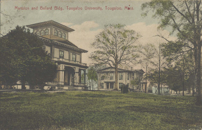 A color image of The Mansion (Robert O. Wilder Building) and the Ballard Building at Tougaloo University in Tougaloo, Mississippi is featured on this postcard. The mansion on the left is a three level building with dentil molding along the rooflines and arched windows on the top level and a lush, leafy tree obscuring the left corner of the building. The Ballard Building to the right is a two story building with trees growing in front of and beside it. the title of the card is printed in red along the top of the image.
