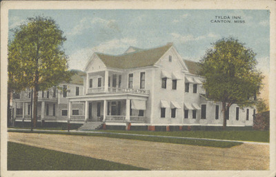 A color illustration of the Tylda Inn in Canton, Mississippi is featured on this postcard. The inn is a two story building with white awnings over the windows, a long front porch and a short second story balcony. Trees are on the lawn of the inn. The title of the card is printed in the upper right of the image.