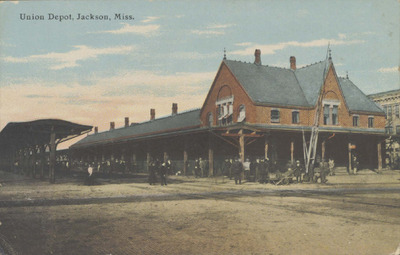 A color illustration of the Union Depot in Jackson, Mississippi is featured on this postcard. The depot buildings is depicted to the right with several people standing near it and some on the tracks beside it. A covered platform is on the left side of the image. The title of the card is printed in the upper left of the image. "With love to Auntie from Amy" is written in pencil on the back.