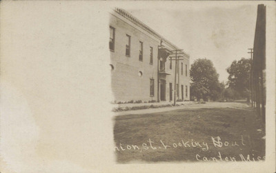 A black and white photograph of Union Street in Canton, Mississippi is featured on this postcard. The photo is faded or damaged on the left half leaving on a partial view of a two story building and a dirt street. The title of the card is written on the bottom of the image.