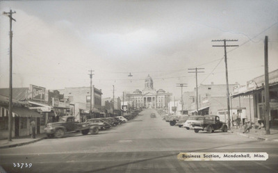 A black and white photograph of a street in Mendenhall, Mississippi shows storefronts and commercial buildings on either side of the street with cars parked at the sidewalks. Utility poles line the sidewalksand people are pictured walking or sitting in front of the stores. The Simpson County courthouse can be seen a tthe very end of the street with a tall dome in the center and two smaller domes on either side of it. The title of the photograph is printed in a white text box in the lower right corner of the image.