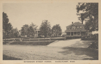 A sepia toned image of two houses and lawns on Extension Street in Hazelhurst, Mississippi is pictured on this postcard. Trees are on the lawn of the large, two story homes and stone retaining walls run along the lawan a the sidewalk. Shrubs line the driveways. The title of the card is printed along the bottom edge of the card. An inscription addressed to Gloria and Herry Russell is written on the back of the card.