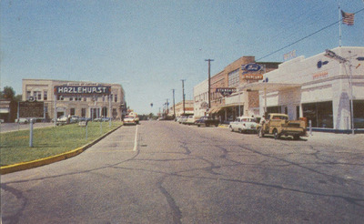 A color photograph of a street in Hazelhurst, Mississippi is pictured on this postcard. The Center of Copiah: Hazelhurst building is on left side of the street and the Ford Mercury and Standard Oil buildings are visible on the right with cards parked at the sidewalks on their side of the street. A brief paragraph about Hazelhurst is printed on the upper left corner on the back of the card.