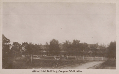 A black and white photograph of the main hotel building at Coopers Well in Raymond, Mississippi is pictured on this postcard. The view of the two story building largley obscured by tall, leafy trees.. The title of the card is printed along the bottom edge of the card and the date of the photo is written on the back.
