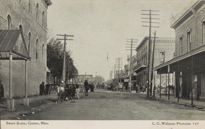 A black and white photograph of a street in Canton, Mississippi is pictured on this postcard. Buildings with utility poles spaced along front are on either side of the street and horse-drawn carriages or waggons are depicted on the street. The title of the card, as well as the photographer's name, is printed along the bottom of the card. And inscription addressed to Mrs. M. C. Scott in Texas is written on the back of the card.