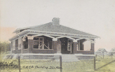A color illustration of the one story Y. M. C. A. building in D'Lo, Mississippi is depicted in this postcard. The building is brick with white molding on the porch and white dentil molding along the roofline. A chimney is in the center of the hip style roof. The title of the card is written in black along the bottom of the image.