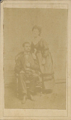 A man and a woman are featured in this sepia toned portrait. The man is pictured seated, wearing a dark, three piece suit with one hand tucked inside his coat and the other resting on his knee. The woman is pictured wearing a long dress with stripes on the hems and a white collar, leaning on the man with one arm resting on his shoulder. The photographer is identified on the pack of the photograph.