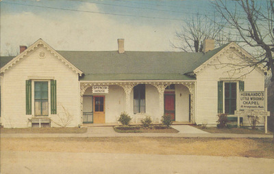 A color photograph of Hernando's Little Wedding Chapel at the Spencer House in Hernando, Mississippi is featured on this postcard. The chapel is a cream colored clapboard building with and entrance on each end , a green roof and green shutters, and a gabled roof with scalloped molding on each end. A sign that reads "Spencer House" is hanging from the porch roof at the left entrance and a sign advertising the wedding chapel is in front of the right end of the building. A sidewalk runs in front of the building with walkways that lead to each entrance. A paragraph advertising the chapel is printed in the upper left on the back of the card.