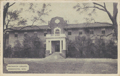This black and white postcard features a photograph of a building at Whitworth [Female] College in Brookhaven, Mississippi. The three story building bares Spanish Colonial influence with a square, column lined porch at the entrance and an arched window above the attached balcony and an arched facade in center of the roof elevation. Small trees line the front of the building and two threes frame the building. The title of the card is printed in a text box in the lower left corner. The back of the postcard is postmarked Durant, Mississippi, May 1, 1942 and a green, Statue of Liberty postage stamp is in the upper right corner. A note is written to Myrtis (Mrs. W. E. Aaron from Gertrude.