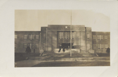Brookhaven High School, a two story building with a star on the façade above the front entrance, is featured in this black and white photograph. People are pictured seated on the stone bench in front of the front entrance. The location of the photograph is handwritten on the back of the photograph.