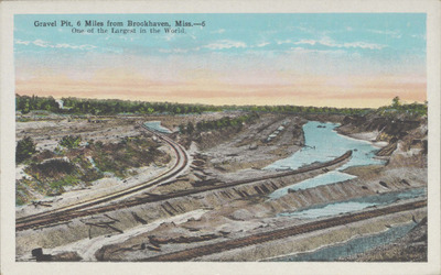 A color illustration of the gravel pit of the Brookhaven Gravel company is featured on this postcard. The railroad tracks, shrubbery, and water holes are depicted. The title is printed along the top, left of the card and an advertisement for the company is printed on the back, touting the gravel pit as one of the largest in the world, shipping seventy-five cars per day.