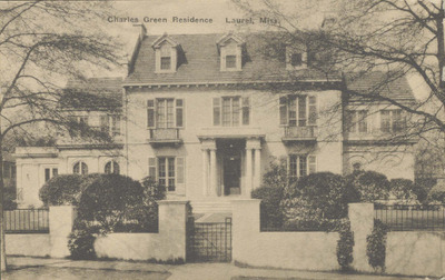 A black and white photograph of the three level home of Charles Green in Laurel, Mississippi is featured in this postcard. The house is three levels in the center and two levels on either side with dormer windows along the roof of the center third level. Double round columns flank the front door and trees and shrubs frame the home. A stone and iron fence with an iron gate are in front of the home. The title of the card is printed in black along the top edge of the card.