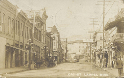 A sepia toned image of the storefronts and businesses on Oak Street in Laurel, Mississippi, is featured on this postcard. People, horses, and automobiles are pictured on the side of the street and lampposts and utility poles line the sidewalks. Signs for restaurants and other businesses are visible and a streetcar is pictured in the street. The title of the card is written in white along the bottom right edge of the card. An illegible postmark is on the back of the card beside a green, one cent, George Washinton postage stamp and the note written on the left half of the card is illegible due to damage to the back of the card.
