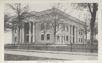 A black and white photograph of the Jones County Courthouse in Ellisville, Mississippi is featured on this postcard. The courthouse is a two story building with round columns at the entrances and dental molding around the top edges of the building. Trees and a small gazebo are in the courtyard and a black iron fence runs between the sidewalk and the yard of the courthouse. The title of the card is printed along the bottom edge of the card.