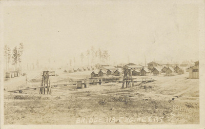 A sepia toned image of a bridge among a number of small cabins, titled "Bridge 113 Engineers" is featured on this postcard. The title is written in white along the bottom edge of the card.