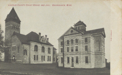 A black and white image of the Lincoln County Courthouse and Jail in Brookhaven, Mississippi is featured on this postcard. The courthouse, pictured on the left, is a split-level building with a tower on the left, front corner, arched windows, and arched entrance. The county jail, pictured on the right, is a three story building with a cupola in the center of the roof and an gabled front elevation. The windows in of the center of the second floor are arched an all the windows have bars over them. The title of the card is printed in red along the top of the image and the publisher is printed in small, red print along the right edge of the image.