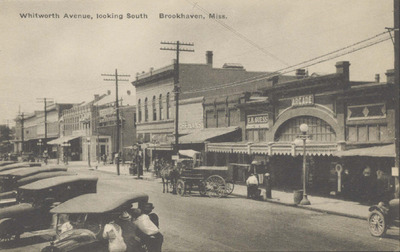 A black and white photograph of Whitworth Avenue in Brookhaven, Mississippi is featured on this postcard. Storefronts, including an arcade, E. B. Guess, and Hoffmans are pictured on the right side of the street with a horse and buggy parked in front of the E. B. Guess store and people walking the sidewalk. Utility poles line the street at the sidewalk. A line of automobiles parked at the sidewalk is pictured on the left side of the street. The car in the foreground has four men in hats leaning inside the driver side window. The title of the card is printed along the top of the image.