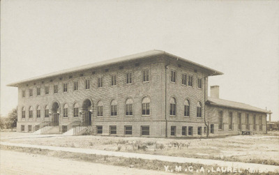 A black and white photograph of the Y. M. C. A. building in Laurel, Mississippi is featured on this postcard. The front section of the brick building is three stories tall and the back section is one story. The windows and the entrances on the second floor of the front section are arched and each entrance includes a tall set of steps with hand rails. The title of the card is written in white in the bottom right of the image.