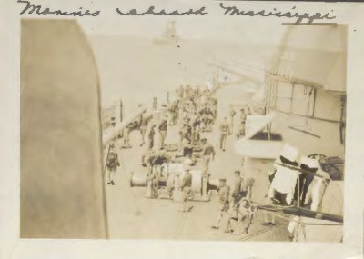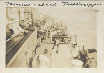 This sepia toned photograph features a group of Marines in uniform and Navy sailors in white uniform and hats on deck of the U. S. S. Mississippi Naval battleship. "Marines aboard Mississippi" is written along the top edge of the photograph.