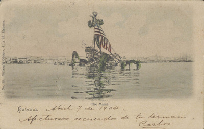 This postcard features a color illustration of the U. S. S. Main where it sank in Havana Harbor in Habana, Cuba. A United States flag can be seen hanging from the mast where it stands from the wreckage. "The Main" is printed below the image and "Habana" is printed in the lower left of the card. An inscription is written in Spanish below the image and title. [see transcription field] The back of the card is addressed to Gonzalo Camara in Merida Lucatan, Mexico. The card is postmarked Habana, Cuba, April 7, 1906 and a red Maximo Gomez postage stamp is in the upper right.